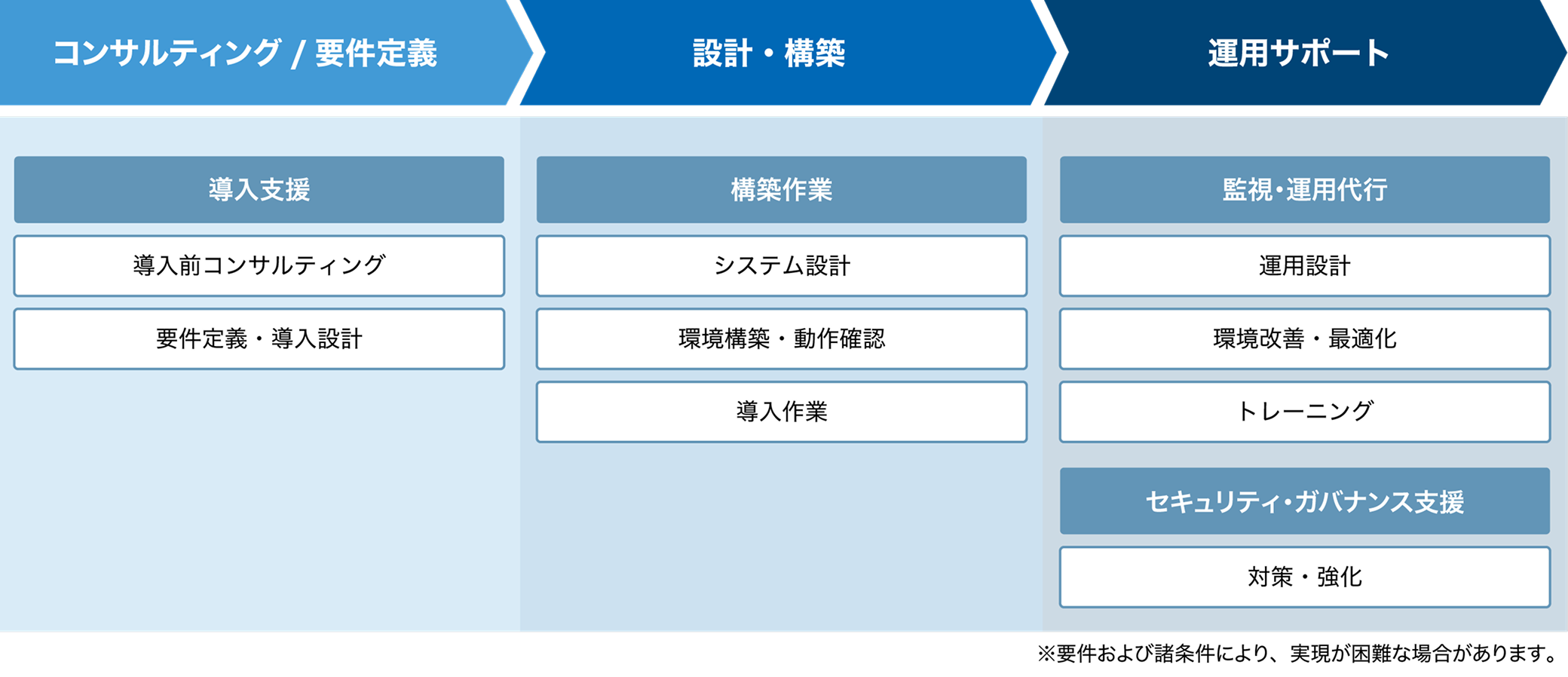 導入に向けたグランドデザインの策定から、導入、運用監視までを一貫してワンストップで提供します。