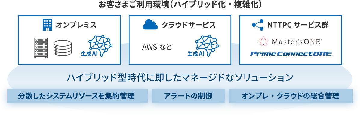 生成AI・クラウド・オンプレ・ネットワークサービスを複合的に導入しているお客さま環境下でも運用監視までをワンストップで提供するマネージドなソリューションにより、導入以降も安心かつ効率的な運用の実現が可能です。
