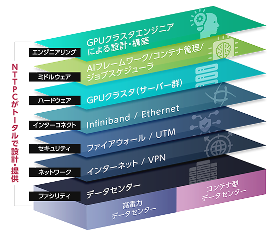 NTTグループ唯一のNVIDIAのエリートパートナーであり、国内先駆けとして2017年からGPUサーバーの販売およびGPU プラットフォーム構築を提供、既に120社/1,600台以上の提供実績を持っています。そのノウハウと最新技術の活用をGPUプライベートクラウド™に集結、全てのレイヤーの一級のエンジニアリング力、調達力、運用力の「総合技術力」でシステム全体を組み上げます。