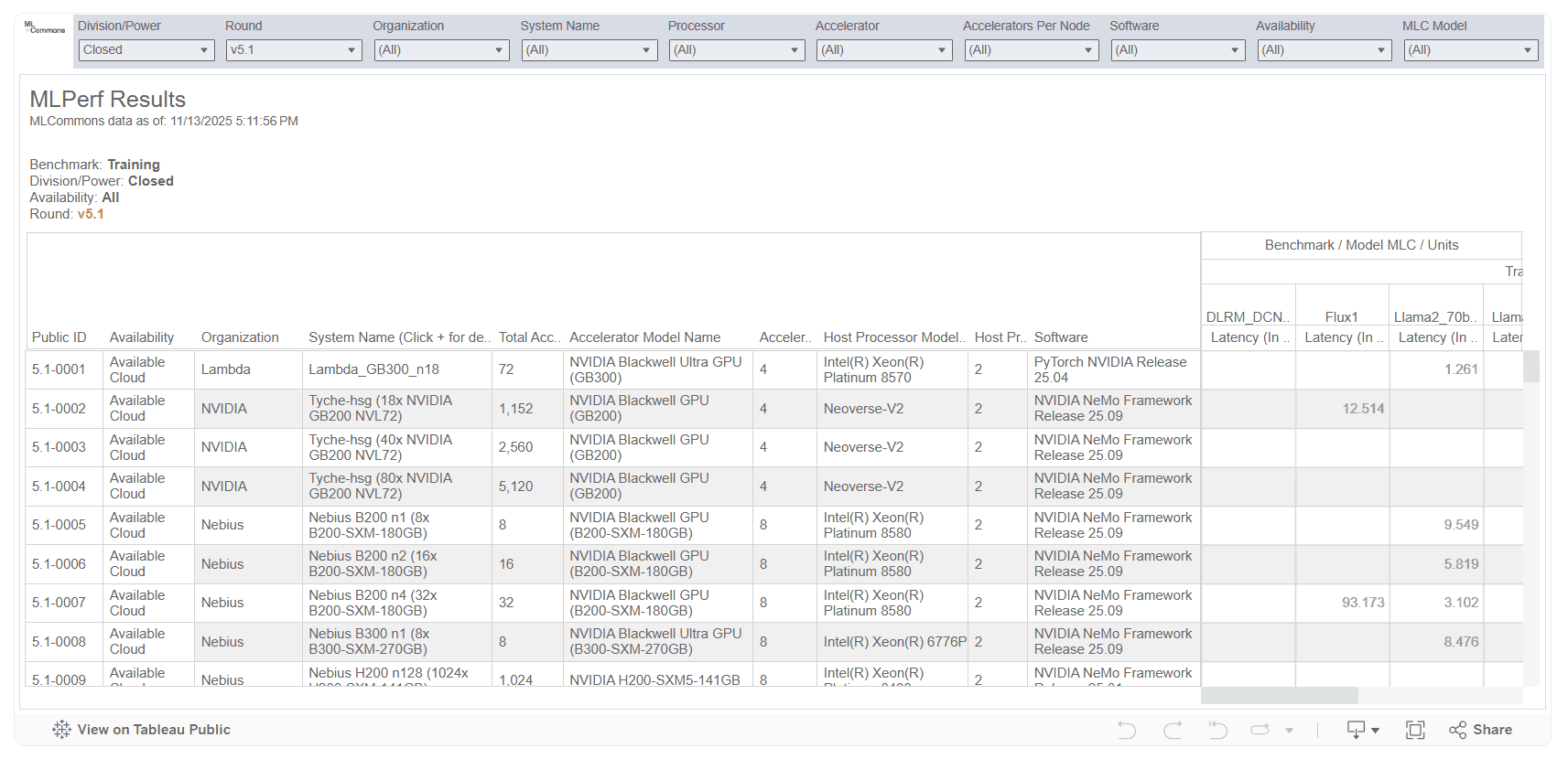 ただし、この差は GPU 型番単体の性能差を示しているわけではありません。同じ列の中でも、各行を見比べると、総 GPU 数(Total Accelerators)やノード数、構成規模が異なる投稿が含まれていることが分かります。学習性能の数値は、これらの構成条件やインターコネクト、ソフトウェア最適化の影響を受けた結果として表れています。そのため、学習性能をより厳密に比較する場合には、Llama2 列の中から、総 GPU 数や構成条件が近い行同士に注目し、Latency がどのように変化しているかを見ることで、構成ごとの傾向を推定していくことになります。