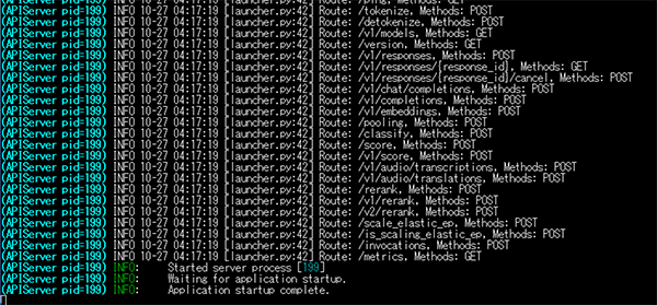 また、--rm は付けていません。コンテナを毎回削除してしまうと、モデルキャッシュやインストール済みのvLLMをすべて再構築する必要があるため、検証環境では永続コンテナとして運用しています。
