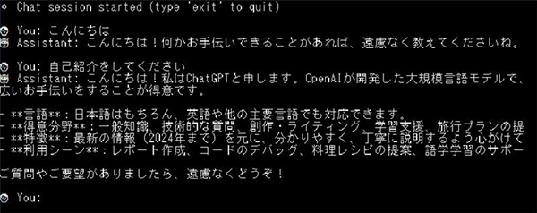 推論サーバーがきちんと動いているか、試しに簡単な対話側のスクリプトを組んで実行してみます。