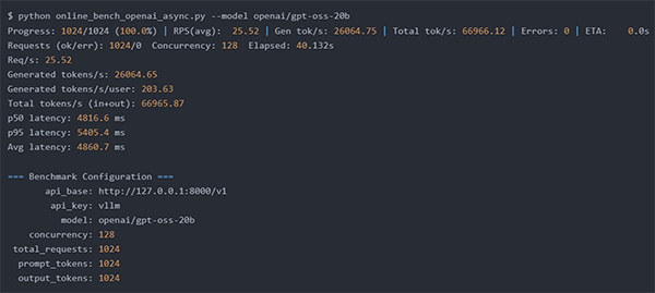 vllm bench serve \ --host 0.0.0.0 \ --port 8000 \ --model openai/gpt-oss-20b \ --dataset-name random \ --random-input-len 1024 \ --random-output-len 1024 \ --ignore-eos \ --max-concurrency 512 \ --num-prompts 2560 \ --save-result \ --result-filename vllm_20b_tp8.json