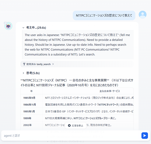 チャットアプリに、私たちNTTPCコミュニケーションズ株式会社の歴史について聞いてみました。うまく実行できていますね!