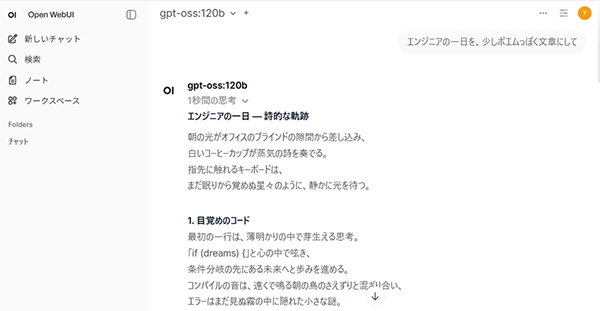 本例の推論バックエンドは「ollama」です。ベンチマーク結果(Decode Throughput)は先述のとおり「40.65tok/s」であり、チャットとしての体感においては「待ち」を意識することなくスムーズに利用できている印象です。