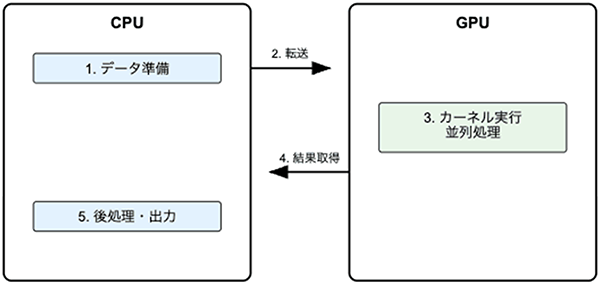CUDAによる並列処理では、ホスト(CPU)とデバイス(GPU)の役割が明確に分かれており、次のような一連のステップで構成されます。