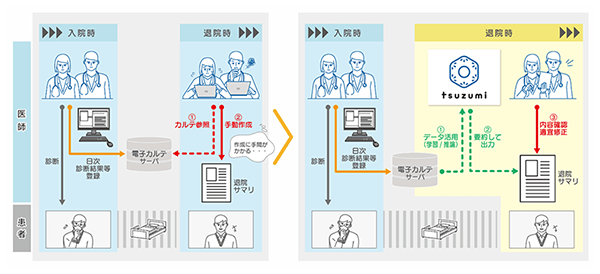 本実証では、医師の事務作業の1つである、患者の入院期間中の診療経過をまとめた「退院サマリ」(年間約1.5万件作成)の作成過程において、「tsuzumi」が生成した電子カルテの要約文章を活用することで、作成業務が効率化できるかを検証します。電子カルテデータを基に医師自らが文章を作成するのではなく、「tsuzumi」が生成した文章を医師が確認・修正することで、作成に要する時間を短縮しつつ、最終的なアウトプットの質を落さない業務フローの実現をめざします。