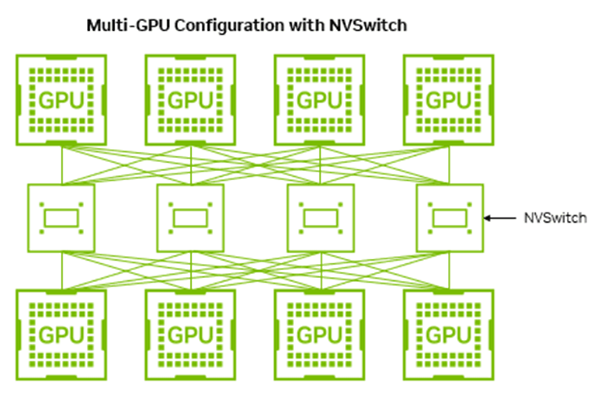 図は、複数のGPUをNVSwitchを介して接続した構成のイメージです。各GPUはスイッチを経由して他のすべてのGPUと均等に通信できるため、大規模な並列処理においても通信ボトルネックを抑えることができます。