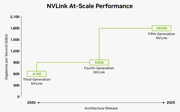 NVLinkは世代を重ねるごとに帯域幅を飛躍的に向上させています。特に、最新の第5世代NVLink(Blackwellアーキテクチャー、GB200/GB300)では、GPUあたり最大1.8TB/s(双方向)という驚異的な通信速度を実現しています。