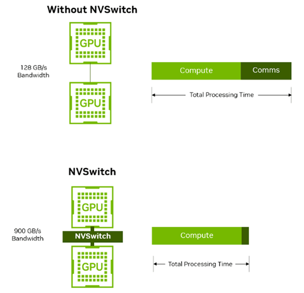 Without NVSwitch構成では帯域幅が約128GB/sに制約されますが、NVSwitchを介することで最大900GB/sに拡張され、GPU間のデータ転送が格段に効率化されます。