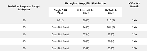 たとえば、Llama 3.1 70Bを2 GPU(TP=2)構成で動かす場合、NVSwitch搭載システムではPoint-to-Point構成と比べて、リアルタイム推論において最大で1.5倍のスループット向上が確認されています。これは、ユーザーが実際に感じる応答速度にも明らかな改善効果をもたらします。