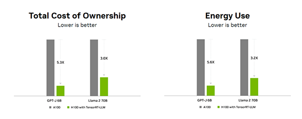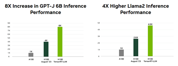 TensorRT、特に TensorRT-LLM は、NVIDIA H100 GPUと組み合わせることで、大規模言語モデルの推論を加速します。ベンチマークでは、GPT-Jで最大8倍、Llama 2で約4倍 の高速化が確認されており、最新GPUとの組み合わせによる最適化効果の大きさが示されています。