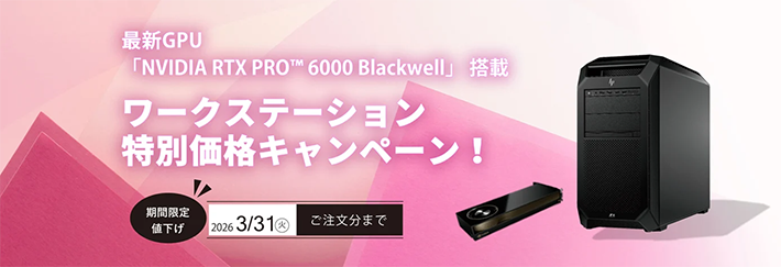 現在当社では、「NVIDIA RTX PRO™ 6000 Blackwell」を搭載したワークステーションの特別価格キャンペーンを開催中です。2026年3月31日ご注文分までの期間限定です。