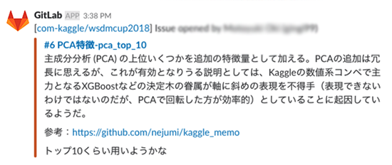 ディスカッションして洗い出したり、各々がデータを眺めながら有効そうな特徴量を考えます。そして、管理しやすいように、特徴量1つにつきIssueを1つ起票します。
