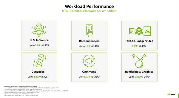 また、前世代のL40Sと比較して、LLM推論で最大約5.6倍、推薦システムで約1.7倍、画像/動画生成で約3.3倍、ゲノミクスで約6.8倍、Omniverseで約2.2倍、レンダリング&グラフィックスで約2.3倍のワークロード性能を提供します。