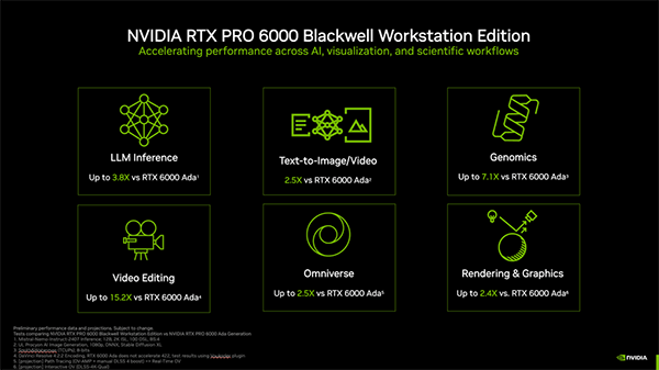 このモデルでは、前世代のRTX 6000 Adaと比較して、LLM 推論で最大 3.8 倍、画像/動画生成で 2.5 倍、ゲノミクスで 7.1 倍、ビデオ編集で 15.2 倍、Omniverse で 2.5 倍、レンダリング&グラフィックスで 2.4 倍のパフォーマンス向上を実現します。