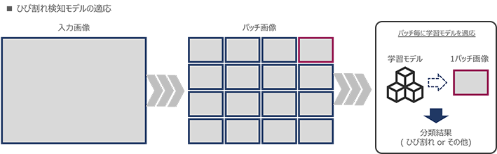 ひび割れモデル単体での精度が9割弱であるのに対して、検知プロセスの精度が8割弱であることに対する考察としては、検知プロセスで実施したパッチ画像への分割に原因があると考えられます。