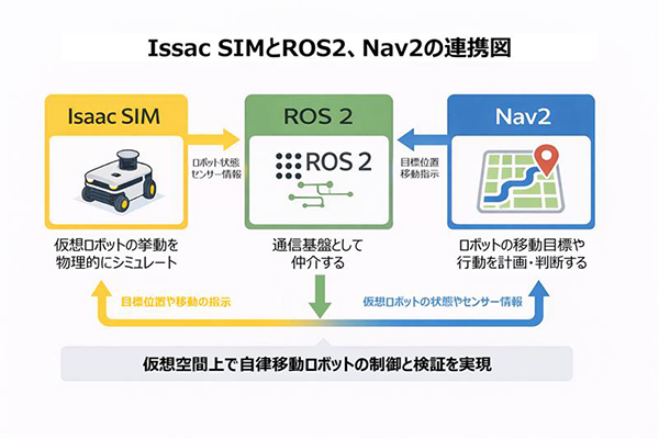 Isaac Sim用ROSワークスペースは、Nav2の判断ロジックを仮想ロボットに適用するための連携層として機能します。