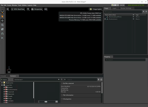 conda deactivate # conda 環境が有効な場合、影響を避けるため無効化(conda未使用の場合は不要) mkdir -p ~/isaac-sim-5.1.0 # Isaac Sim を配置するディレクトリを作成(本記事ではホームディレクトリ配下想定) cd ~/Downloads unzip Isaac Sim-standalone-5.1.0-*.zip -d ~/isaac-sim-5.1.0 # ダウンロードした zip ファイルを展開 cd ~/isaac-sim-5.1.0 ./post_install.sh # 初回起動に必要な依存関係をセットアップ(初回のみ実行) cd ~/isaac-sim-5.1.0 ./isaac-sim.sh # Isaac Sim本体の起動。GUI が起動すればインストール完了