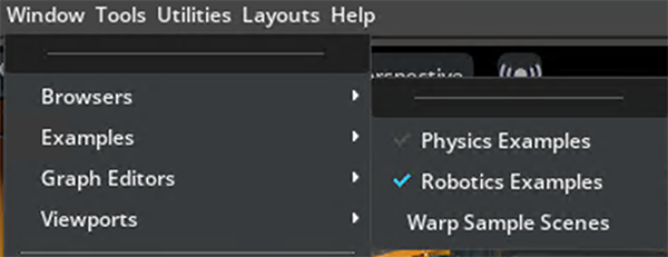 メニューバーからWindow > Examples > Robotics Examplesを開く