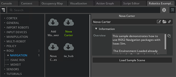 まずはIsaac Simを起動し、次のような手順でサンプルシーンをロードします。このサンプルシーンにはROS 2連携設定も含まれているため、比較的容易にROS2やNav2の連携まで実装できることが特徴です。