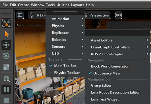 メニューバーからTools > Robotics > Occupancy Mapを開くと