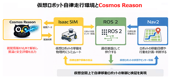 ※Cosmos Reasonは、ロボットを直接制御するエンジンや、速度指令を生成する制御スタックではありません。あくまで「推論を出力するAI」です。その推論結果をどう行動へ反映させるかは、