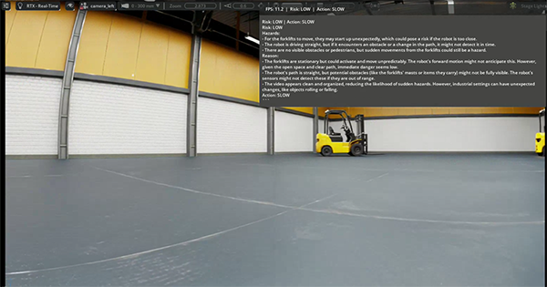 今回のシーンでは、通路上に停止したフォークリフトが存在しています。Cosmos Reasonはこの状況を リスクLOW と評価しつつ、「フォークリフトが突然動く可能性があるため減速して進むべき」という判断を提示しました。興味深い点は、単にフォークリフトを障害物として認識するだけでなく、