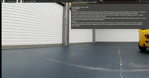 今回のシーンでは、ロボットの視点が床面に近い低い位置にあり、進行方向の床の摩耗跡やフォークリフトの存在が確認できます。Cosmos Reasonはこの状況を リスクMEDIUM と評価し、「フォークリフトの予期しない動きや床面状態、カメラ視点による検知制限を考慮し減速して走行するべき」という判断を提示しました。