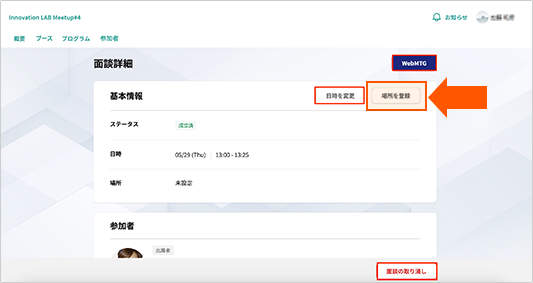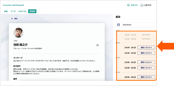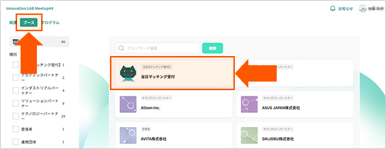 「事前マッチング」「当日マッチング」ともに、マッチングのお申し込みには「Event Hub」をご利用いただきます。ログインしてご利用ください。