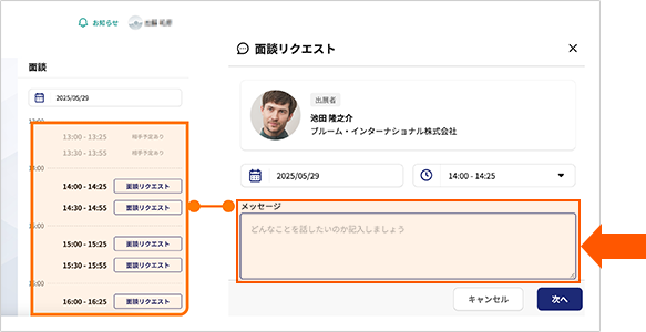なお、面談の受け入れ状況は会場のアナウンスやスクリーンでもご案内いたします。
