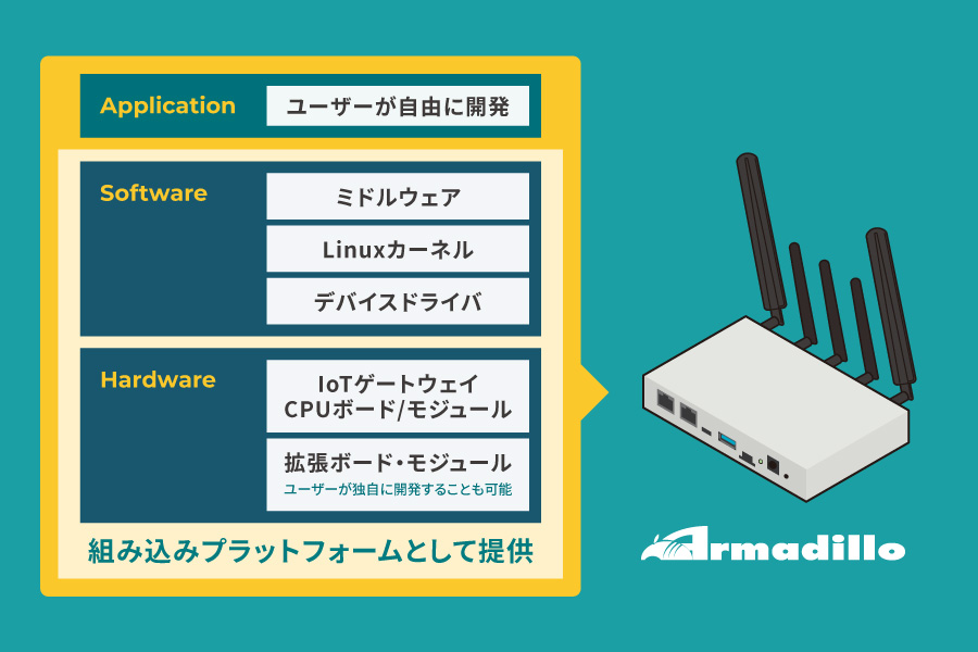 組み込みプラットフォーム「Armadillo」シリーズを提供しています。ユーザーはCPUボード/モジュールとIoTゲートウェイから目的や用途に合ったものを選び、アプリケーションを書き込むだけでオリジナルの製品を作ることができます。