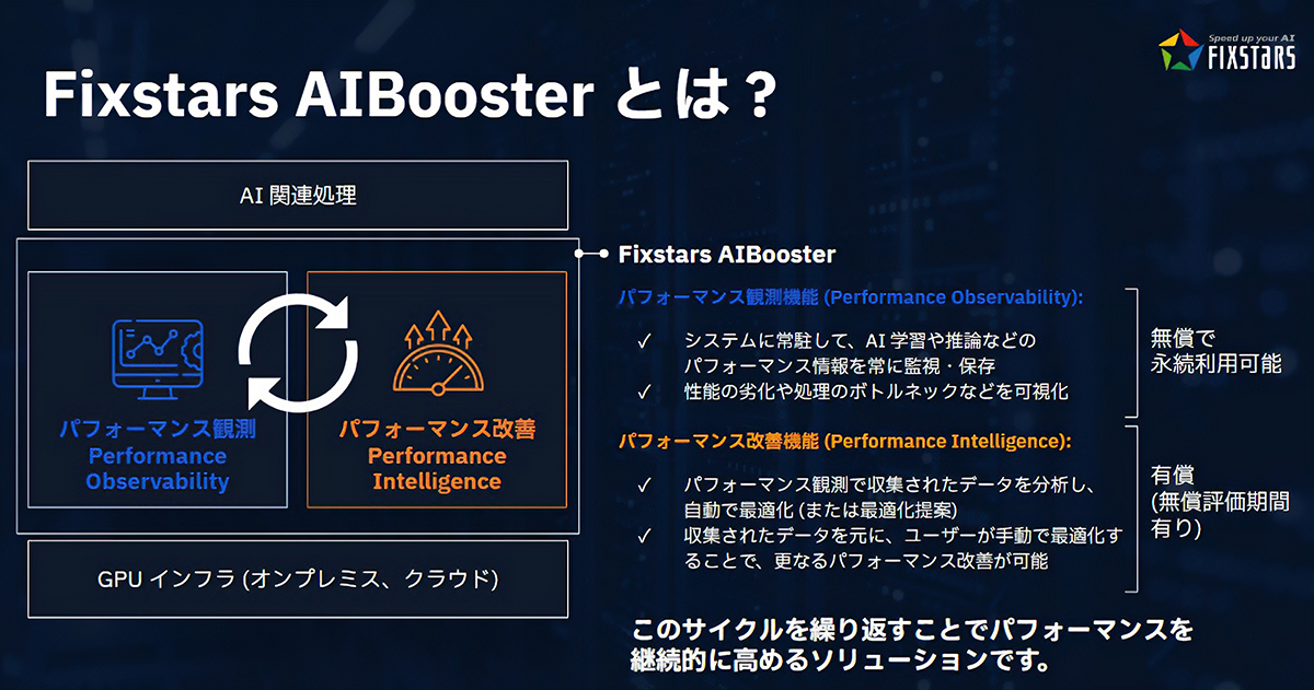 フィックスターズは、“Speed up your AI”をコーポレートメッセージとして掲げるテクノロジーカンパニーです。計算資源を最大限に活用するソフトウェア最適化技術を駆使し、AIモデルの推論処理と学習プロセスの両面で圧倒的な高速化を実現します。
