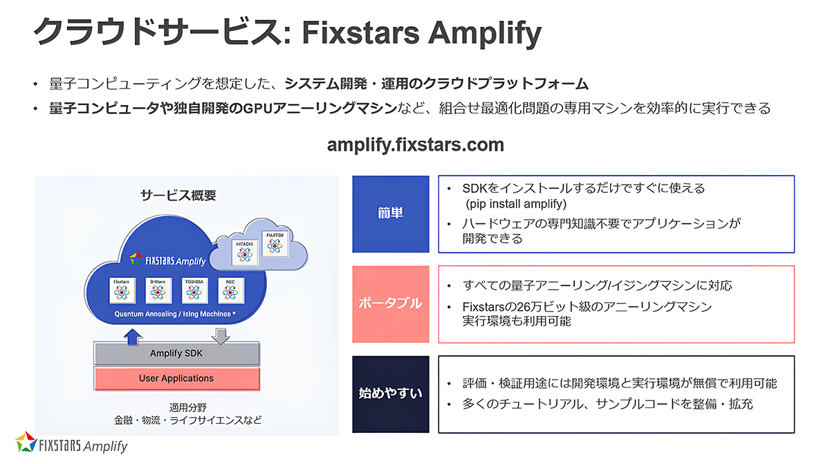 Amplifyは、量子・AI・GPUなどの最先端技術を活用し、複雑な社会課題の解決に挑む最適化クラウドサービスとして、最適化問題を解くためのプログラム開発環境と実行環境を提供しています。