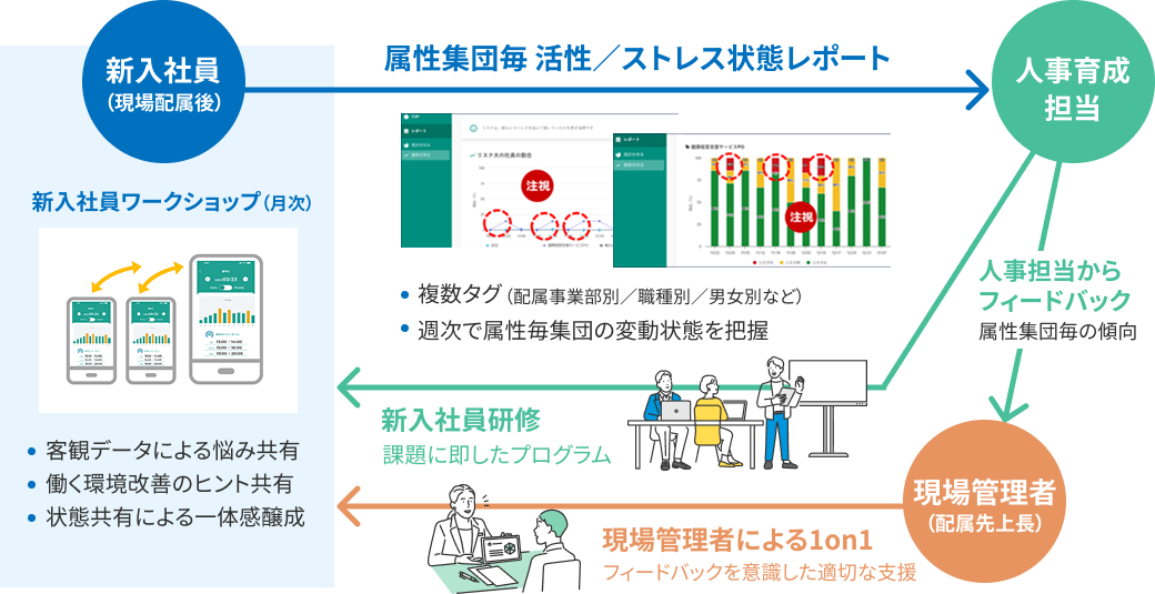 - 入社後の早期退職が課題。状態に即した効果的な研修の実施と効果測定。新人管理者などへも適用