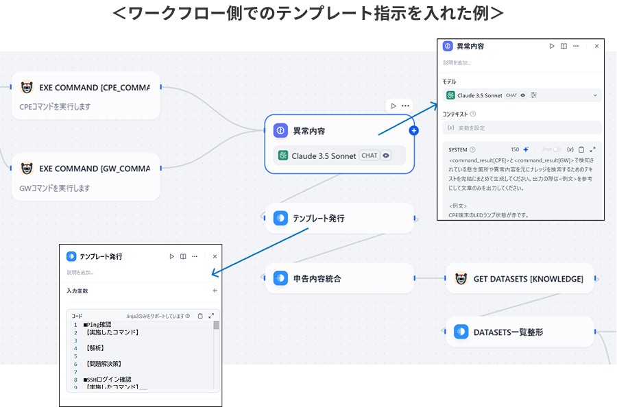 当初のフローでは、CPEの各種コマンドを取得・まとめて分析したのちに、AIエージェントに渡していた。これを修正し、CPEの各コマンドに分析結果をつける「回答テンプレート」に添わせる指示をし、それをAIエージェントに渡すようにした。