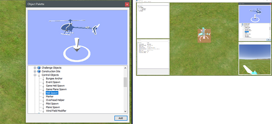 画面左上の"使用中のオブジェクトリスト"から"Pilot Spawn"、"Heli Spawn"を各々選択して、画面左下の"オブジェクのプロパティ"で、位置や角度を設定します。